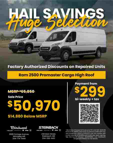 Take advantage of factory-authorized hail savings on Ram ProMaster Cargo Vans, with select units up to $14,880 below MSRP. Visit our booth to learn more or explore our commercial inventory online.